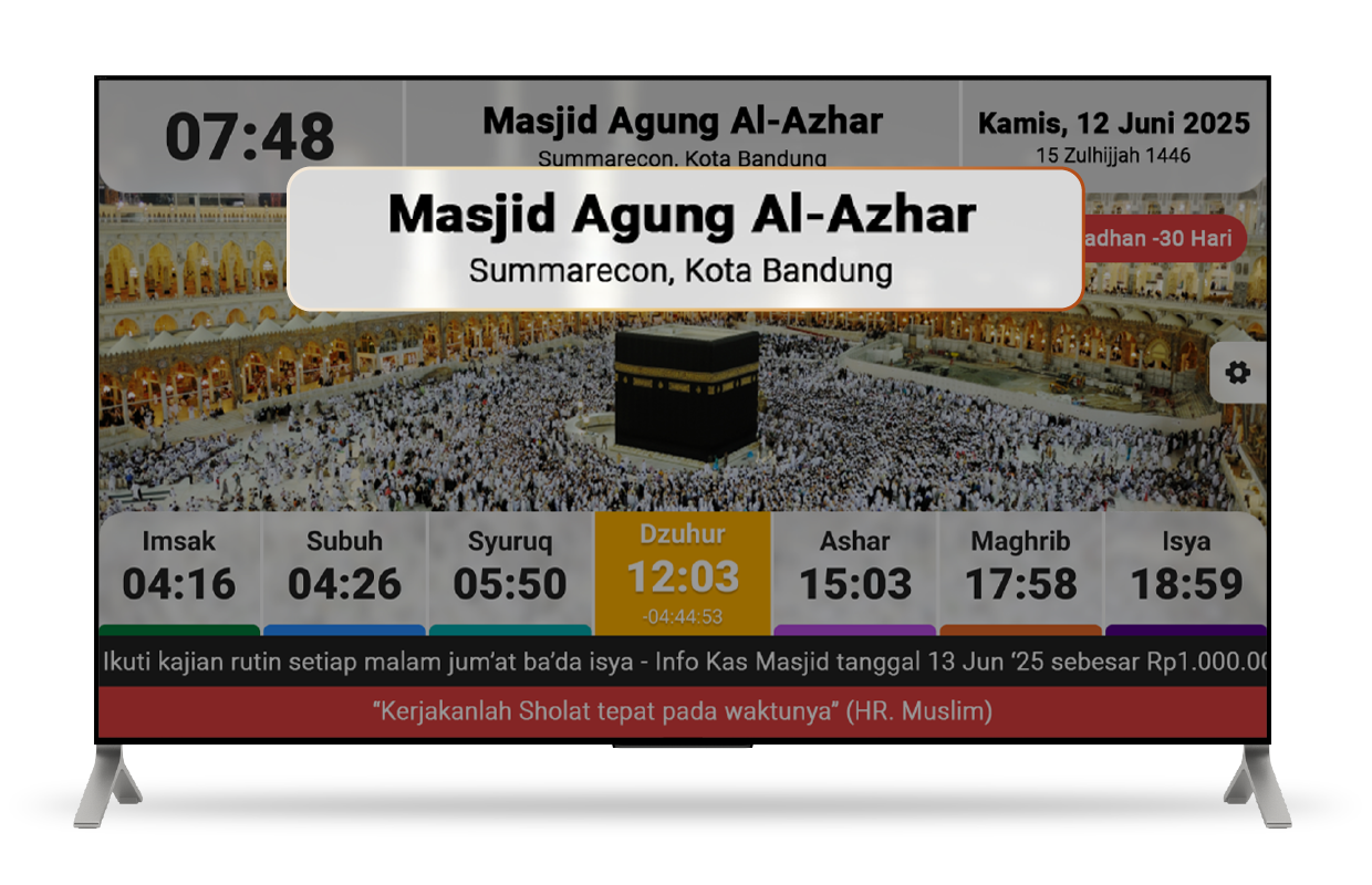 Tampilkan nama, logo dan alamat masjid Anda dengan jelas kepada semua jamaah